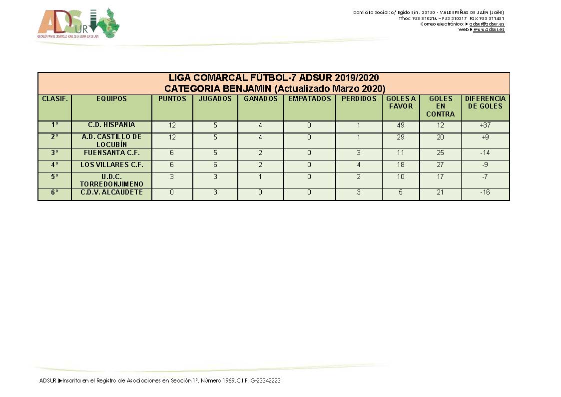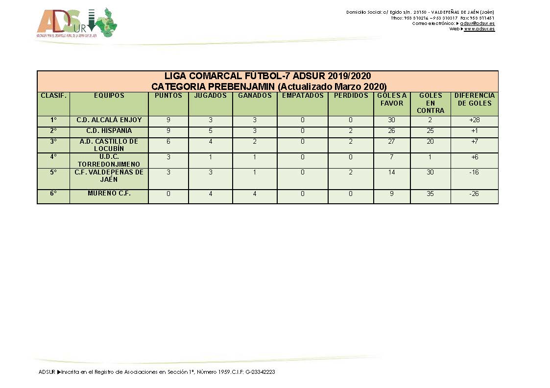 Adsur está deseando volver a repartir felicidad a través de las numerosas actividades deportivas que se realizan por la Comarca Sierra Sur de Jaén. En este caso, os dejamos la clasificación de la Liga Comarcal de Fútbol-7 ADSUR, donde más de 300 niños/as se divierten semanalmente practicando la modalidad deportiva "Fútbol".