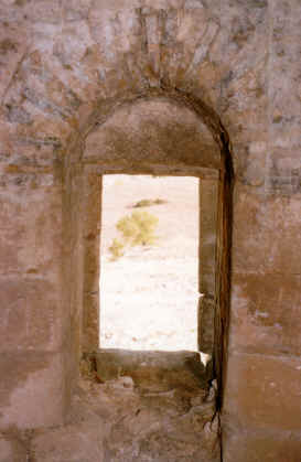 de 2,33 m.La sala superior es circular con un diámetro de 3,62 m. y se cubre con una cúpula semiesférica de mampostería de piezas planas de menor tamaño, que alcanza 3,30 m. con un hueco en el centro. A dicha sala se accede desde una ventana-puerta adintelada (0,50 x 1,00 m.) con un pequeño pasillo abovedado con sillería de 0,66 m. de anchura, que recorre 1,40 m. de anchura del muro hacia el NO. Encastrado en el muro perimetral de la sala se encuentra el acceso a la cubierta: un hueco de 1,15 x 0,54 m. situado a 1,18 m. de altura que da paso a una escalera curva de pendiente muy pronunciada hasta el nivel superior, a 9,83 m. de altura. La coronación de la torre presentaba, en origen, un parapeto de 0,45 m. de anchura en el plomo del paramento, seguido de un matacán corrido de 0,30 m. sobre 40 modillones de 0,90 m. de altura y 0,70 m. de vuelo máximo. Tanto el parapeto como el matacán están prácticamente perdidos en su totalidad y sólo se conservan algunas piezas de las hiladas inferiores. La presencia de mechinales en el paramento exterior, siguiendo un trazado ascendente, se origina probablemente, en la necesidad del uso de estructuras de madera para la construcción de la torre. Andamios que se montaban a cierta altura y se trasladaban posteriormente a una cota superior para permitir la elevación de las piezas de sillería y del relleno interior. |