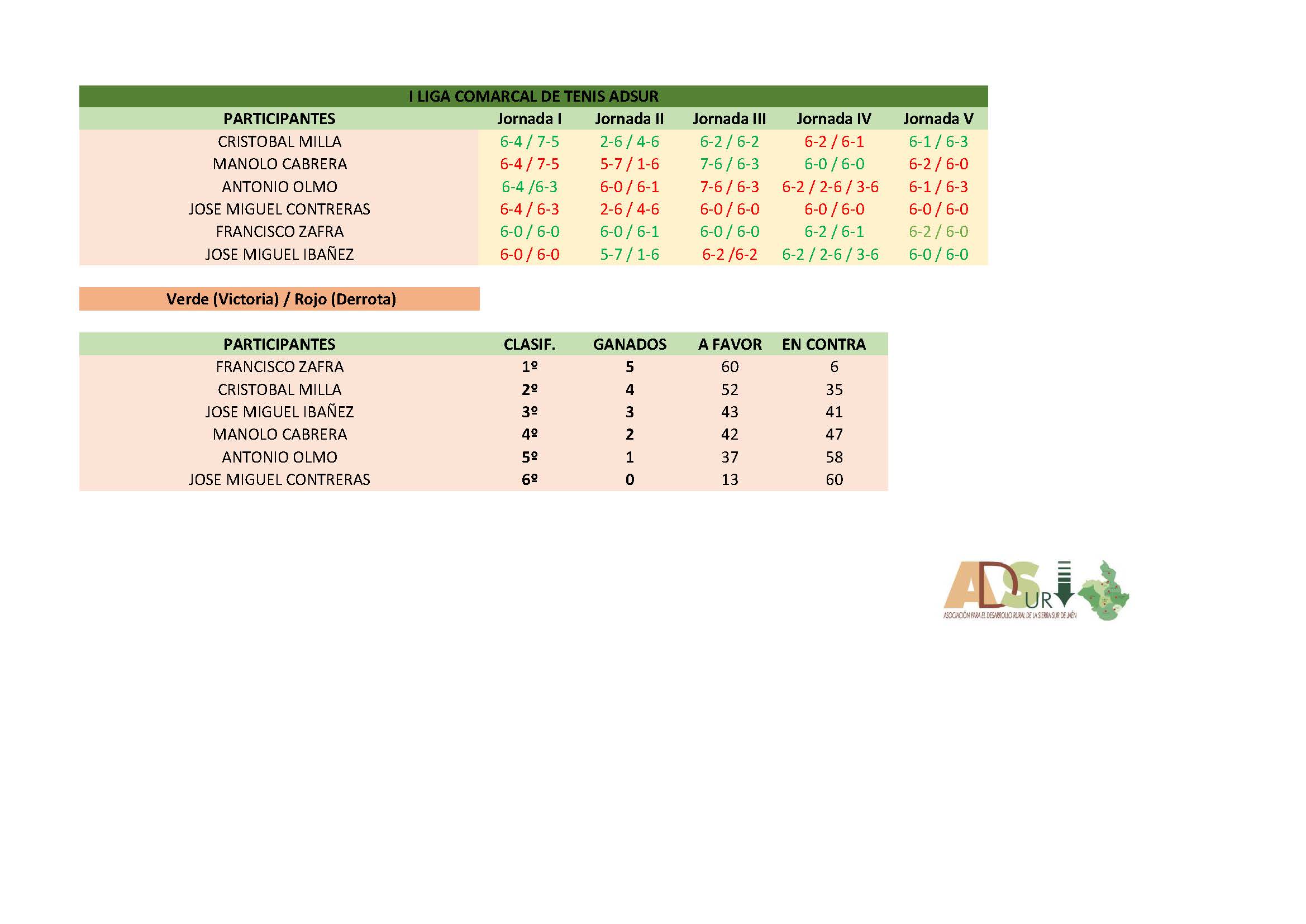 Clasificación de la I Liga Comarcal de tenis ADSUR, tras la ejecución de 5 Jornadas.