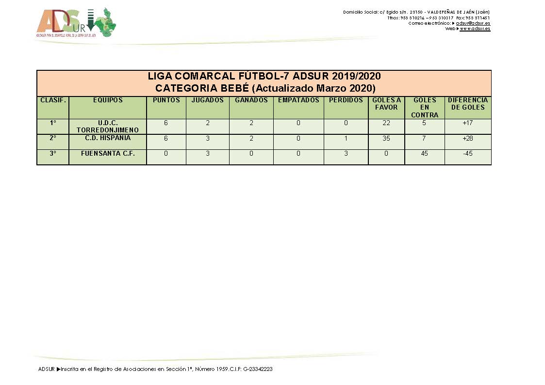 Adsur está deseando volver a repartir felicidad a través de las numerosas actividades deportivas que se realizan por la Comarca Sierra Sur de Jaén. En este caso, os dejamos la clasificación de la Liga Comarcal de Fútbol-7 ADSUR, donde más de 300 niños/as se divierten semanalmente practicando la modalidad deportiva "Fútbol".
